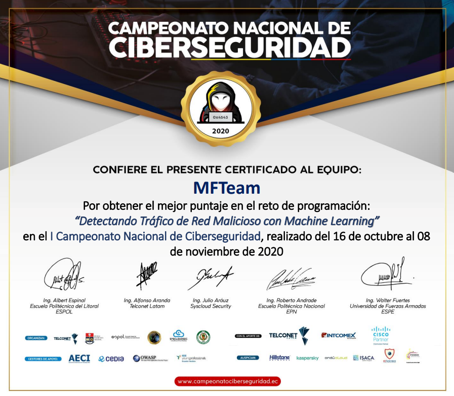 Best score granted to the team ”MFTeam” in the programming challenge: ”Detecting malicious network traffic with Machine Learning”.